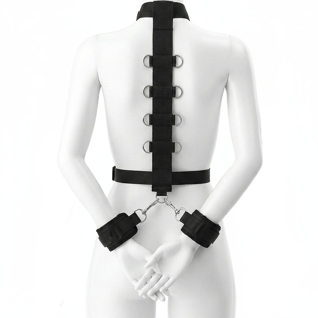 Ensemble harnais à attaches multiples avec menottes et masque pour les yeux